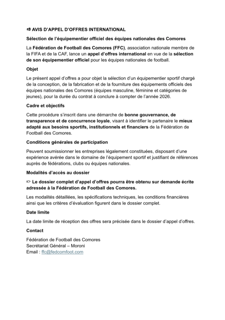 Avis d’appel d’offres international Auteur/autrice de la publication :adminffc Publication publiée :janvier 19, 2026 Post category:Actualités Commentaires de la publication :0 commentaire Read more articles Article précédentLa FFC forme ses formateurs avec l’appui de la FIFA Vous devriez également aimer STEFANO CUSIN, REÇU EN GRANDE POMPE À MORONI. décembre 3, 2024 Calendrier de la ligue Ngazidja mai 7, 2024 Des progrès dans la gestion financière décembre 12, 2024 Laisser un commentaire Annuler la réponseCommentEnter your name or username to comment Enter your email address to comment Saisir l’URL de votre site (facultatif) Enregistrer mon nom, mon e-mail et mon site dans le navigateur pour mon prochain commentaire. Δ